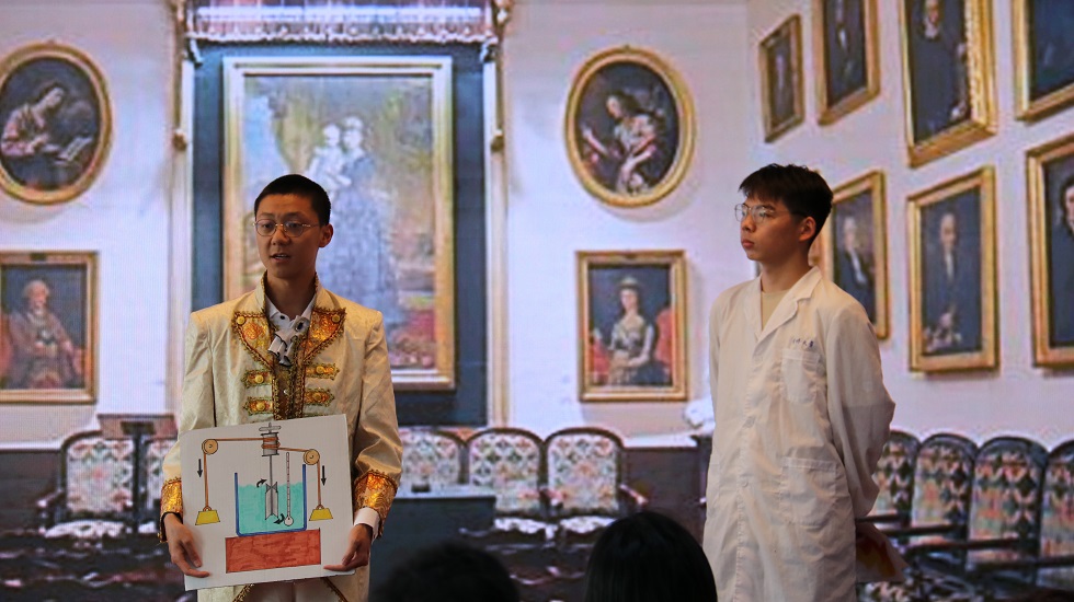 課程教師殷開梁介紹了課堂劇的創(chuàng)作背景。他指出,發(fā)現(xiàn)、分析、解決問題的過程非常重要,希望同學們在這個過程中培養(yǎng)科學素養(yǎng)和科學精神、學會如何思考。同學們在深入查找資料的基礎上,將文字內(nèi)容轉化為人物語言、動作、神情等輔助舞臺和旁白,進行了生動的表演。劇中搭配西歐服飾道具和舞臺背景,讓邁爾、焦耳等科學家“活”起來、“動”起來,通過話劇的形式生動演繹了熱力學第一定律的發(fā)展過程,帶來了一場跨越古今的對話。身臨其境的演繹讓同學們體驗到了科學的發(fā)展充滿艱辛和困苦,也體會到了其中的科學家精神。