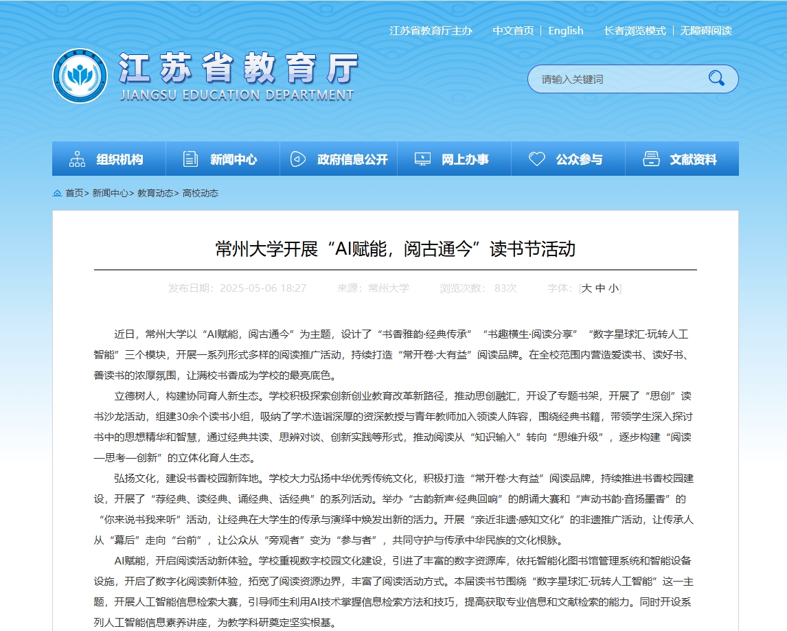 近日,常州大學以“AI賦能,閱古通今”為主題,設計了“書香雅韻·經典傳承”“書趣橫生·閱讀分享”“數字星球匯·玩轉人工智能”三個模塊,開展一系列形式多樣的閱讀推廣活動,持續打造“常開卷·大有益”閱讀品牌。在全校范圍內營造愛讀書、讀好書、善讀書的濃厚氛圍,讓滿校書香成為學校的最亮底色。